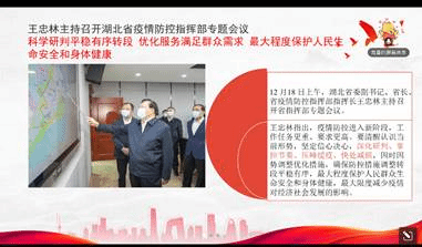 党日活动第三部分,支部党员湖北省委疫情防控工作要求进行了学习。12 月18 日上午,湖北省委副书记、省长、省疫情防控指挥部指挥长王忠林主持召开省指挥部专题会议。王忠林指出,疫情防控进入新阶段,工作任务更重、要求更高。要清醒认识当前形势,坚定信心决心,深化研判、掌控节奏、压峰缓疫、快处减损,因时因势调整优化措施,确保防控措施调整转段平稳有序,最大程度保护人民群众生命安全和身体健康,最大限度减少疫情对经济社会发展的影响。王忠林强调要突出抓好医疗救治和宣传引导,要着力加强物资保障,要强化农村地区防疫指导。