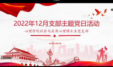 2022年12月31日下午17:00,华中师范大学心理学院社会与应用心理博士生党支部开展12月主题党日活动。由于疫情防控原因,本次党日活动开展采用线上会议方式进行。活动由支部书记吴旭瑶主持,支部党员海曼领学。支部党员同志共25名,22名党员参加本次党日活动,3名党员同志因病请假。12月份主题党日活动共包含三个内容:(1)继续学习宣传贯彻党的二十大精神;(2)学习领会中央经济工作会议精神;(3)传达学习湖北省委疫情防控工作要求。