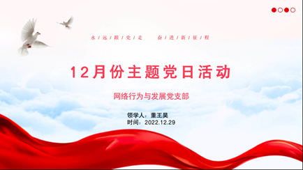 2022年12月29日晚上,华中师范大学心理学院网络行为与发展博士研究生党支部采用线上方式在腾讯会议开展了12月份主题党日活动。本次活动由支部宣传委员董王昊同志领学,网络行为与发展博士党支部全体党员参加了本次党日活动。
