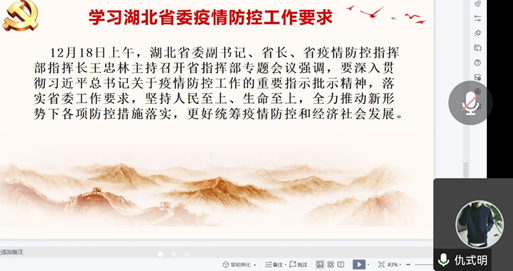 最后,仇式明同志带领大家学习了湖北省委疫情防控工作要求。疫情防控进入新阶段,工作任务更重、要求更高。要清醒认识当前形势,坚定信心决心,深化研判、掌控节奏、压峰缓疫、快处减损,因时因势调整优化措施,确保防控措施调整转段平稳有序,最大程度保护人民群众生命安全和身体健康,最大限度减少疫情对经济社会发展的影响。