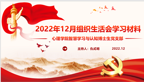 2022年12月29日中午1点,华中师范大学心理学院智慧学习与认知博士研究生党支部在线上开展了12月主题党日活动。本次党日活动由支部仇式明同志领学,智慧学习与认知博士研究生党支部全体党员参加。