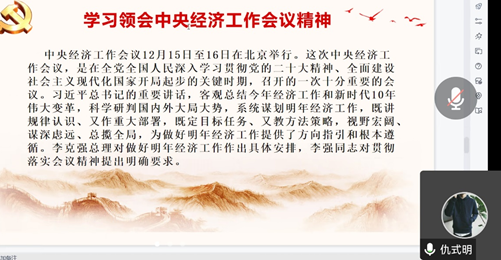 接下来仇式明同志带领大家学习领会了中央经济工作会议精神。中央经济工作会议12月15日至16日在北京举行。这次中央经济工作会议,是在全党全国人民深入学习贯彻党的二十大精神、全面建设社会主义现代化国家开局起步的关键时期,召开的一次十分重要的会议。习近平总书记的重要讲话,客观总结今年经济工作和新时代10年伟大变革,科学研判国内外大局大势,系统谋划明年经济工作,既讲规律认识、又作重大部署,既定目标任务、又教方法策略,视野宏阔、谋深虑远、总揽全局,为做好明年经济工作提供了方向指引和根本遵循。李克强总理对做好明年经济工作作出具体安排,李强同志对贯彻落实会议精神提出明确要求。