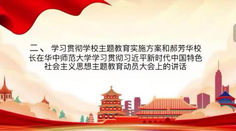 活动第二项,学习贯彻主题教育实施方案和郝芳华校长在华中师范大学学习贯彻习近平新时代中国特色社会主义思想主题教育动员会大会上的讲话。刘慧玲向大家朗读了郝芳华校长在华中师范大学学习贯彻习近平新时代中国特色社会主义思想主题教育动员大会上的讲话稿,党员同志们对习近平新时代中国特色社会主义思想有更全面和深入的理解,也对郝芳华校长提到的学校主题教育实施方案更加了解。