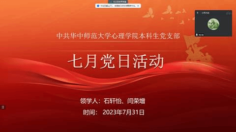 2023年7月31日下午,华中师范大学心理学院本科生党支部在腾讯会议以线上的方式开展了7月主题党日活动。本次党日活动由支部成员闫荣增和石轩怡同志领学,本科生党支部全体党员参加。会议由支部书记刘幽悠主持。