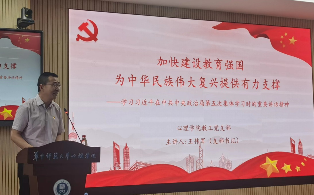 王伟军同志首先领学了习近平总书记在中共中央政治局第五次集体学习时的重要讲话。总书记首先阐述了建设教育强国的重要意义,然后强调我们要建设中国特色社会主义教育强国,必须以坚持以党对教育事业的全面领导为根本保证,以立德树人为根本任务,以为党育人、为国育才为根本目标,以服务中华民族伟大复兴为重要使命,以教育理念、体系、制度、内容、方法,治理现代化为基本路径,以支撑引领中国式现代化为核心功能,办好人民满意的教育。