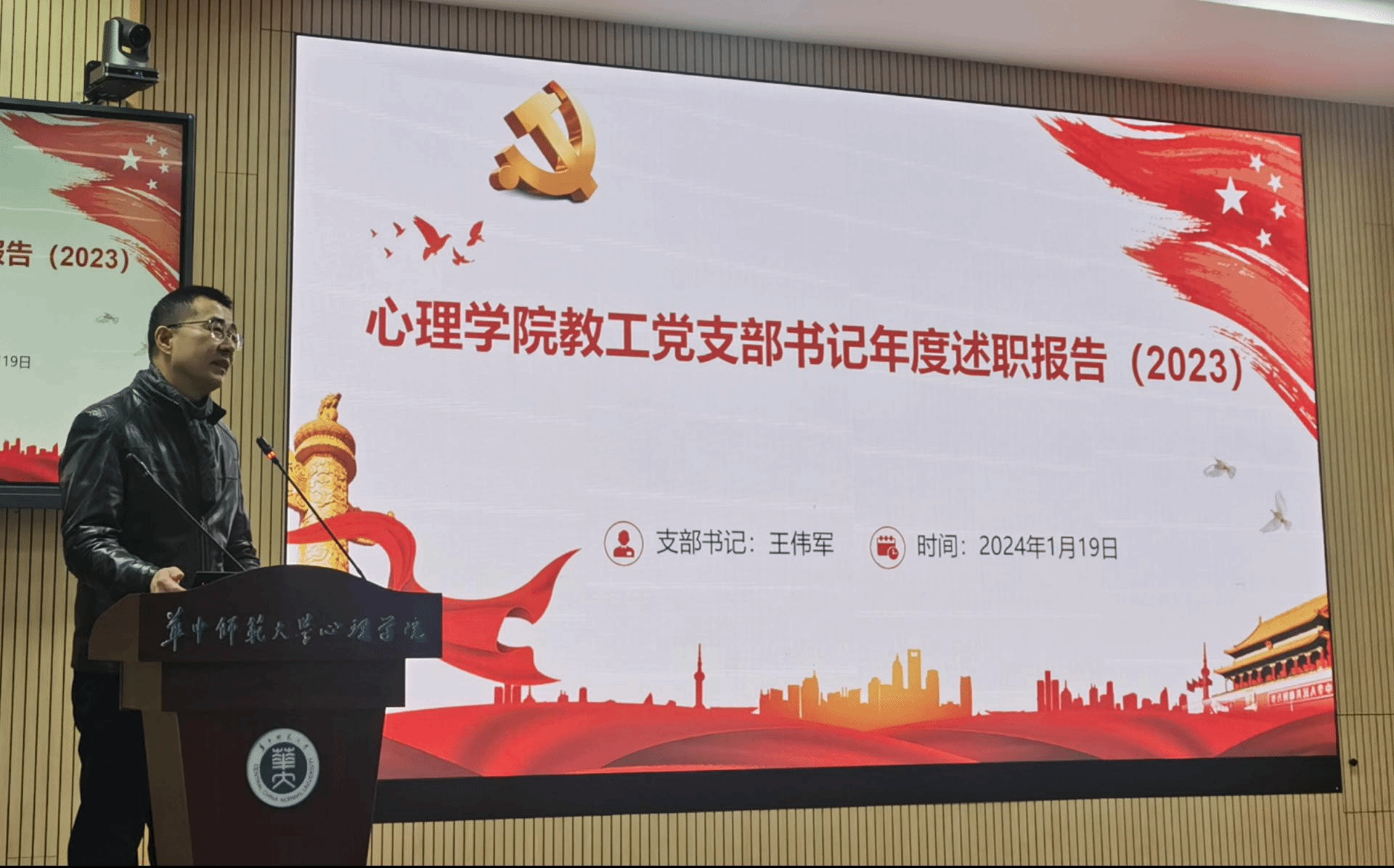 2024年01月19日上午,心理学院教工党支部在8060报告厅开展2024年01月主题党日学习活动暨2023年度支部工作述职会议,教工党支部支委温芳芳、唐汉瑛、刘勤学领学,支部书记王伟军作2023年支部工作述职,教工支部全体党员参会。
