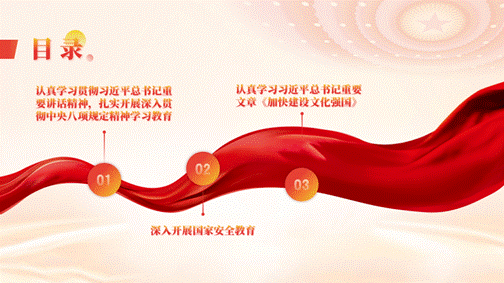 4月份支部主题党日活动主要有三个方面的内容,分别是:(1)认真学习贯彻习近平总书记重要讲话精神,扎实开展深入贯彻中央八项规定精神学习教育(2)深入开展国家安全教育(3)认真学习习近平总书记重要文章《加快建设文化强国》。