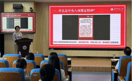 会上,王琍主任以“持续筑牢中央八项规定堤坝,以优良作风护航学校‘双一流’建设”为主题,围绕“什么是中央八项规定精神”“违反中央八项规定精神问题表现及案例”“如何落实好中央八项规定精神”三个方面进行了系统全面、深入浅出的讲解。王琍主任强调,中央八项规定精神是管全党、治全党的行为准则,覆盖全体党员干部、公职人员及教职工,彰显了党抓作风建设“以上率下”“久久为功”的决心。王琍主任还传达了学校党委关于深入贯彻中央八项规定精神学习教育的部署,强调需紧扣 “学、查、改” 一体,要推进树牢看齐意识;要坚持以上率下,发挥领导干部的示范带头作用;要强化职能监管,机关部处要从严履行监督职责;要压实责任链条,推动二级党组织扛牢主体责任;要加强监督检查,对违规违纪行为严肃追责问责。