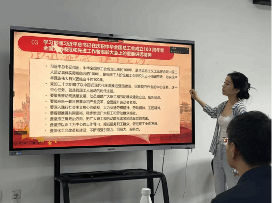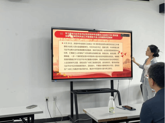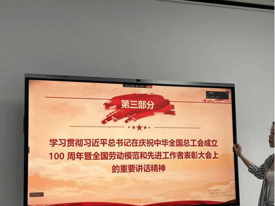 接下来,会议第三部分学习习近平总书记在庆祝中华全国总工会成立100周年大会上的讲话。叶芷妤同志梳理了中国工会百年奋斗历程,重点阐释“劳模精神、劳动精神、工匠精神”的内涵。她强调,习近平总书记提出“高质量发展离不开高质量的劳动创造”,鼓励党员将劳动精神融入科研实践。博士生党员应结合自身课题,以“干一行、爱一行、钻一行”的态度攻克科研难题。