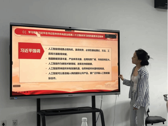 叶芷妤同志首先带领全体党员深入学习习近平总书记在中共中央政治局第二十次集体学习时的讲话精神。4月25日下午,中共中央政治局就加强人工智能发展和监管进行第二十次集体学习,习近平总书记强调人工智能是“引领新一轮科技革命和产业变革的战略性技术”,要求我国在基础理论、高端芯片、基础软件等核心领域实现自主突破,构建自主可控的人工智能生态体系。结合心理学专业特色,党员们围绕“人工智能与心理健康服务融合”展开讨论,提出可探索AI在心理评估、干预方案设计等领域的应用潜力,同时强调需坚守科技伦理,避免技术滥用风险。