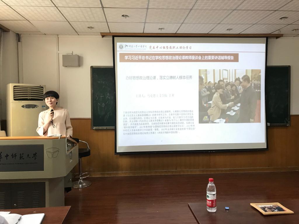 丁茜以“办好思想政治理论课,落实立德树人根本任务”为主题,传达了习近平总书记在学校思想政治理论课教师座谈会上的重要讲话精神。她指出总书记的讲话高屋建瓴,强调要理直气壮开好思政课,而办好课程的关键在教师,“六个要”就是教师学习、努力的标杆。同时,她阐释了总书记在未来思想政治改革的方向的论述,解读“八个统一”组合拳的深刻内涵。随后,丁茜还提出“揉、合、融、分”四个具体的工作要点,提倡学院抓好工作特色,坚持集体备课制度,善用社会资源,融合信息技术,因材施教,构建课程思政的工作格局。