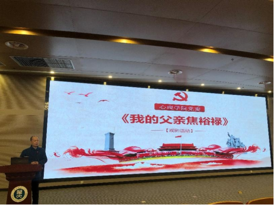 为深入学习贯彻习近平总书记在庆祝中国共产党成立100周年大会上的重要讲话精神,充分发挥党史题材电影的宣传教育作用,弘扬红色文化,传承红色基因,切实做到学党史、悟思想、办实事、开新局,11月19日下午,心理学院党委组织各党支部在综合楼一楼报告厅观看了主题教育电影《我的父亲焦裕禄》。观影活动开始前,学院党委书记马新华做了简短发言。