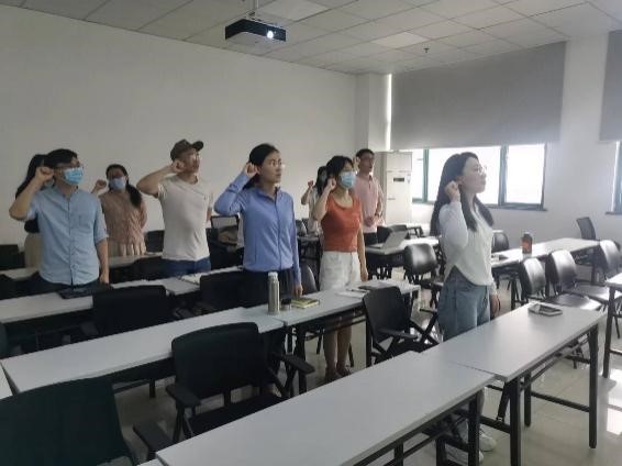 接下来,由金剑同志和贾丹丹同志进行毕业生经验的分享。两位同志分别结合自己博士的经历给同志们分享了一些经验,也表达了对党支部的感谢和肯定,并给支部提供了未来发展的建议。并由金剑同志作为毕业生代表带领支部全体党员同志重温并宣读入党誓词。