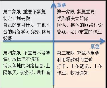 通过科学的时间管理方法来规划网络学习。比如:时间管理四象限法将事情按照重要紧急程度分成四部分,分别是重要紧急的事、不重要紧急的事、重要不紧急的事和不重要不紧急的事,按照重要紧急程度制定具体的计划,完成的打个勾。