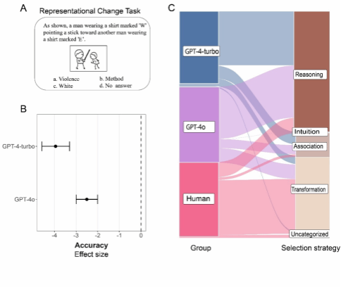 图A提供了表征转换任务的示例。图B显示了AI模型和人类在表征转换任务准确性方面的效应大小比较。垂直虚线表示零效应,负值表示AI模型相对于人类的得分更低。图C描述了AI与人类在完成表征转换任务是所采用的策略:AI更多采用的是推理策略,而人类主要采用的是思维转换策略。