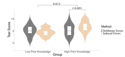 实验2通过前置领域相关案例,提升学习者先备知识,显著增强诱导犯错与正确答案的语义关联。结果显示:高先备知识条件下,诱导犯错的学习成绩显著优于刻意犯错;先备知识对刻意犯错效果无明显影响,印证诱导犯错的核心瓶颈是 “错误与正确答案的语义距离”。