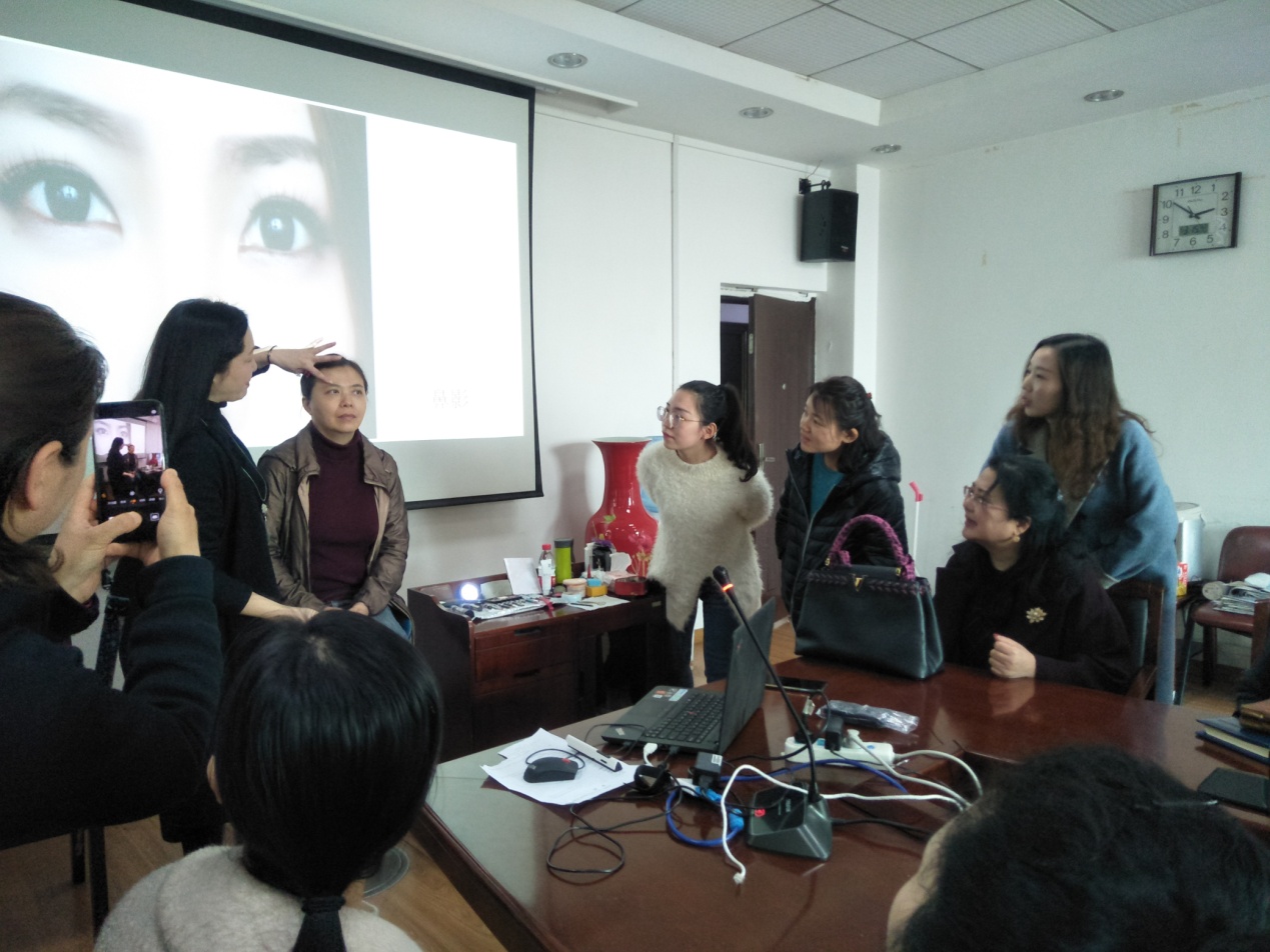 马莉针对生活妆和职业妆两类妆容为在座的女教职工进行了化妆技巧的理论讲解。她从小处着手,以小见大,介绍不同妆容的一般化法之外,又细数生活中的常见例子,指出多数人在化妆时出现的误点、盲点,提醒在座各位在实践过程中留意关注。此外,结合明星人物案例,她一一介绍了画眉、打粉、眼影、高光等步骤的化妆技法。