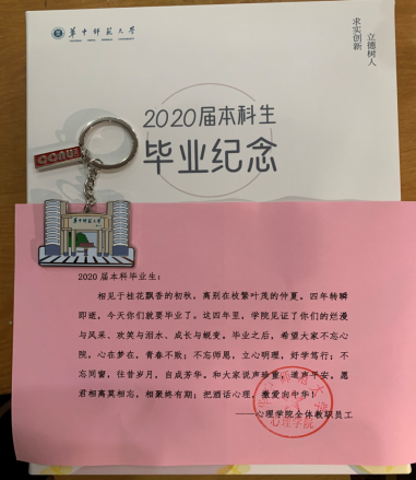 学院为毕业生准备的华师logo钥匙扣和温馨寄语