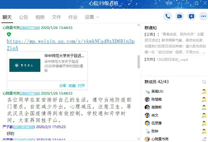 考试结束后,学生陆续返乡。返乡期间,莫书亮通过电话、QQ等了解学生是否安全到家。疫情爆发,他通过班级QQ群安抚学生,鼓励大家当地防疫部门的工作,主动居家隔离,并就学生们如何合理安排生活和学习提出建议。网课时期,他鼓励学生积极适应,有问题多与老师沟通,并提醒学生注意休息,减少用眼疲劳。得知学生参加学校团委的“使命与担当”抗疫征文写作,他主动给予指导,为学生提供保障。