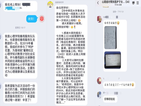 (通讯员 金巧)自新冠肺炎全面爆发以来,全国各地的医护人员第一时间奔赴前线,支援湖北。他们争分夺秒与病毒战斗,但心中仍牵挂着留守家中的孩子。为此,心理学院团委响应校团委的号召,于2月23日起组织开展“你我同是守护者”线上爱心助学志愿服务活动。此次活动采取“一对一”结对形式,即1名大学生志愿者,结对1名医护人员子女,每日通过电话、微信、QQ等线上方式进行心理支持、学业辅导,切实解决一线医护人员的后顾之忧。