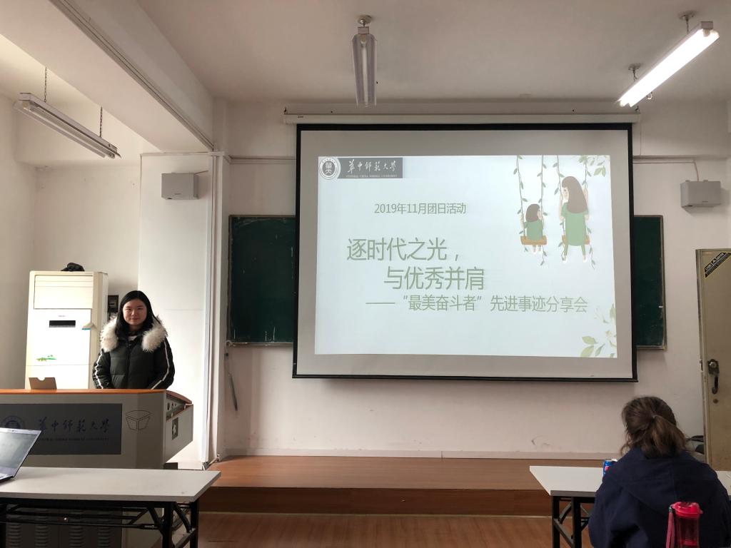 24日,胡雅蕾在支部内发布本次团日活动任务——依据给定的“学习”、“师范生技能”、“实践”、“体育”四个主题,采访1803团支部内的“最美奋斗者”。团员自行分组商讨,决定采访对象与采访内容。29日中午,支部全体成员于华中师范大学田家炳大楼501室进行了采访成果展示活动。