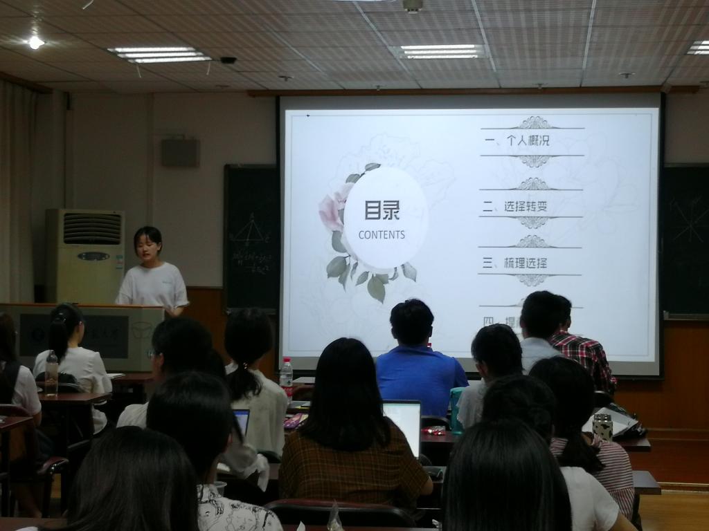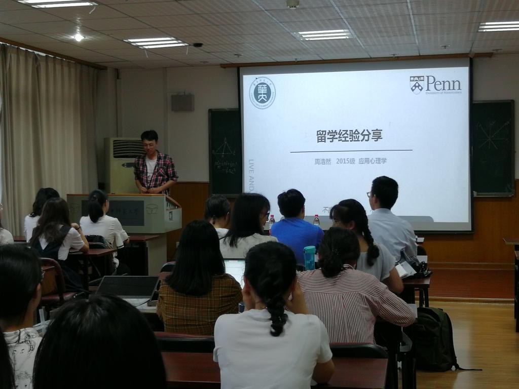 分享会包括出国留学、师范生就业、非师范生就业三个不同方向的经验分享。第一位分享者是已经被美国宾夕法尼亚大学录取的周浩然,他向同学们分享了有关出国留学的经验。从“为什么留学”“留学学什么”到“去哪里留学”“如何成功申请”,周浩然详细介绍了有关出国留学的各个方面,并给出了具体可行的增加申请名校成功率的建议,给有意出国留学的同学很大帮助。