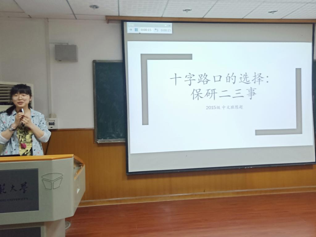 本次会议主要分为两个部分,保研分享和考研分享。15级英文班周菡(目前保研上交)和中文班陈超(目前保研北大)主要就保研进行了分享。她们均以自身经历为切入点,分享了自己的夏令营经历以及保研过程中发生的事情。其中周菡主要从如何获得本校保研资格、如何获得外校保研资格两个方面对保研进行了介绍,而校外保研重点放在了夏令营的介绍,诸如夏令营信息的获取等。陈超则补充道,夏令营offer对外校保研很重要,但也不能忽视“九推”的作用。除此之外,她们也都有分享一些保研笔试及面试技巧。