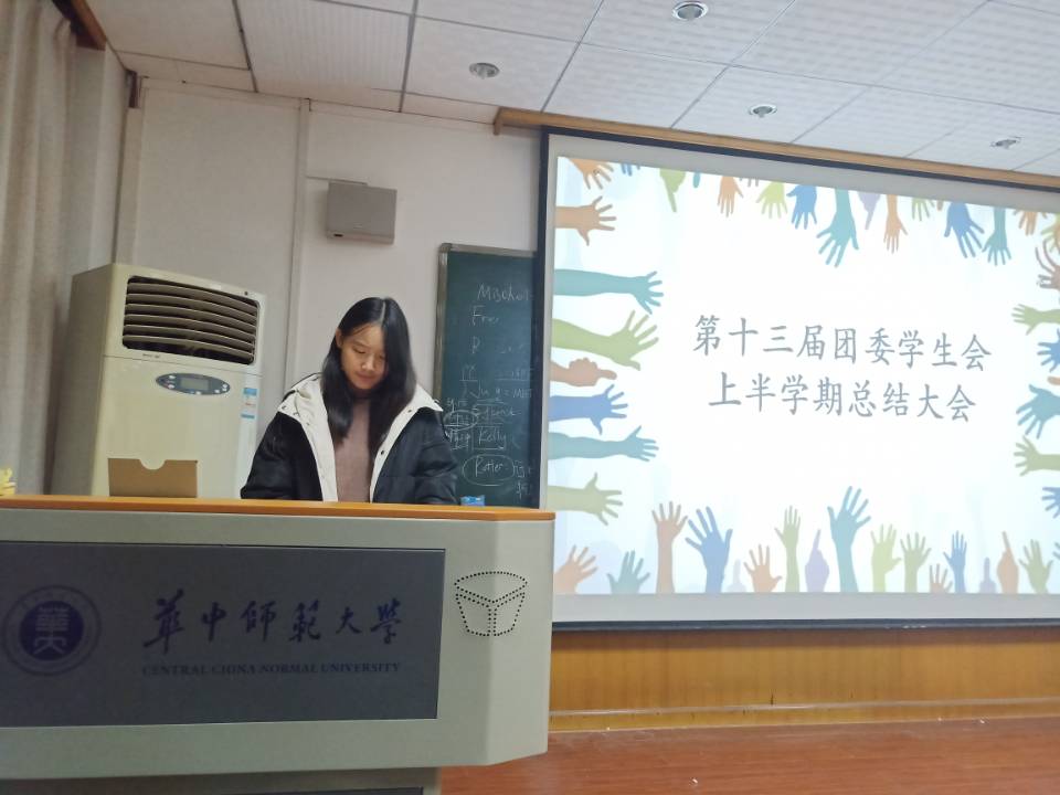 (通讯员 黄金冯 蔡李雪)12月23日晚,心理学院团委学生会召开了2018年第十三届团委学生会上半学期总结大会。出席本次会议的成员有团委副书记赵慧颖、学生会主席杨璐、团委学生会各中心主任、各部门部长及干事。本次会议由组织部干事王俊蒙主持。