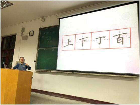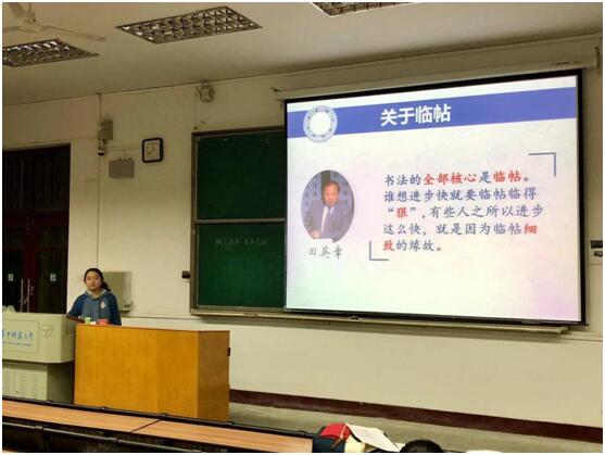 此外,屈妍玥对基本笔画的种类也进行了基本介绍,并对横、竖、撇、捺、点等等进行一一详细解说。同学们对笔画要领有了近一步了解,包括起笔、顿笔、运笔、回锋、行笔节奏等多个方面其中,屈妍玥举例在写长横这一笔画时,要注意起笔要先顿笔,然后上行笔扛肩,最后顿笔,且不能太过夸张。通过现场练习、现场指导、教学视频展示等多种形式,屈妍玥逐步让同学们熟悉了笔画笔法,引导同学们感悟临帖的精华。同学们也积极地配合培训,严格按照笔画要领练习,在几位助教的耐心指导下,将临帖要领落实到书法的实践中。