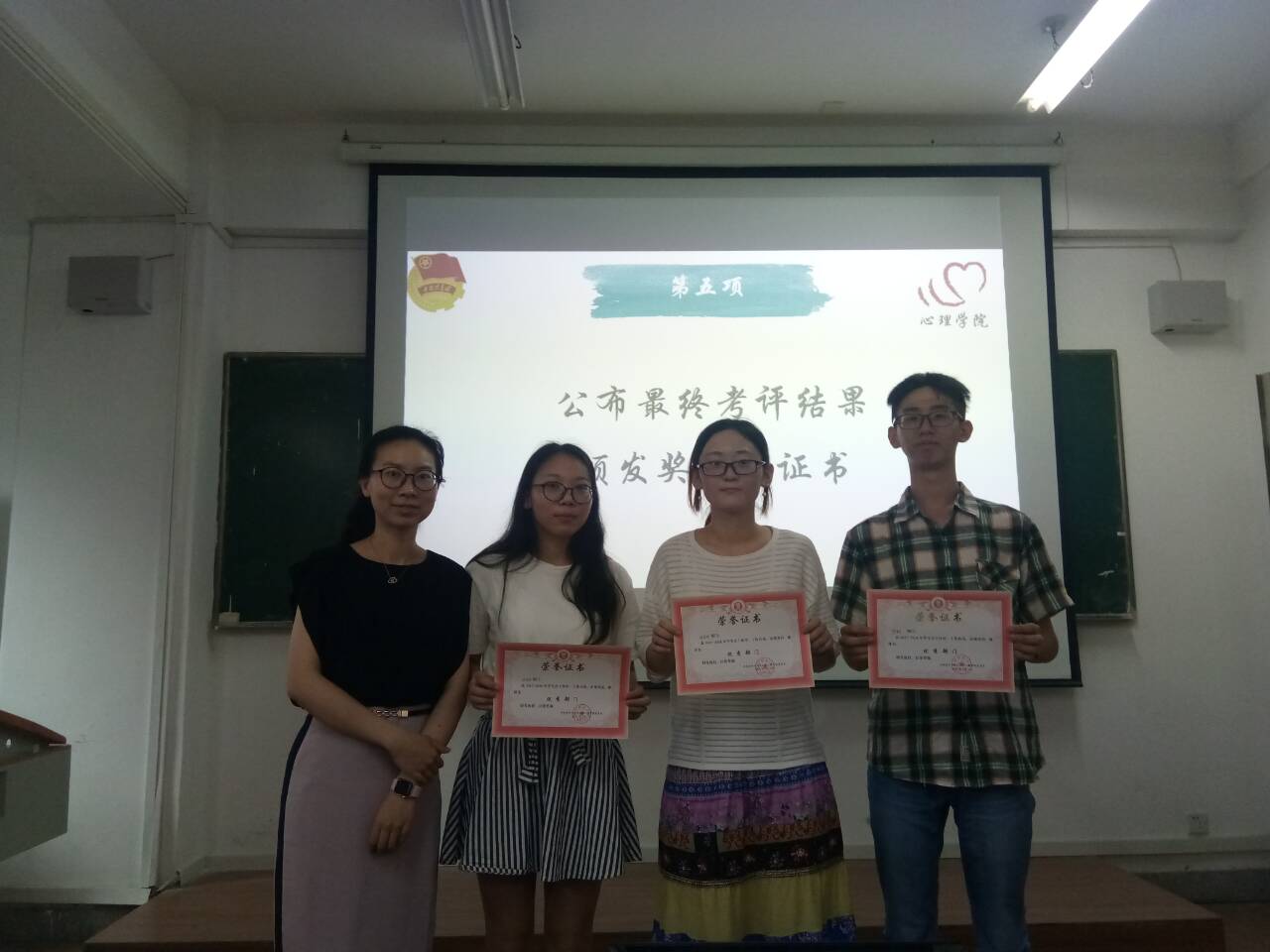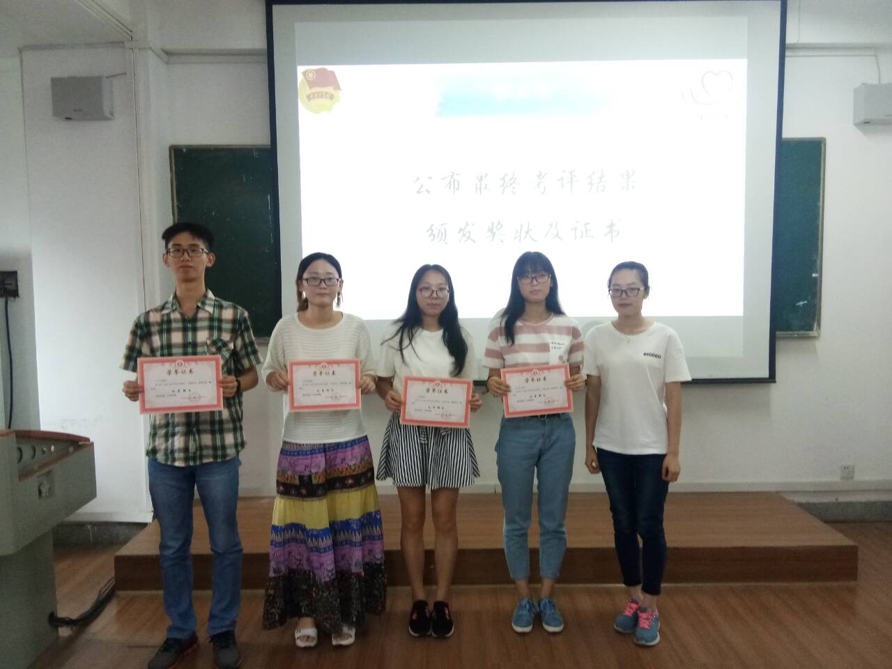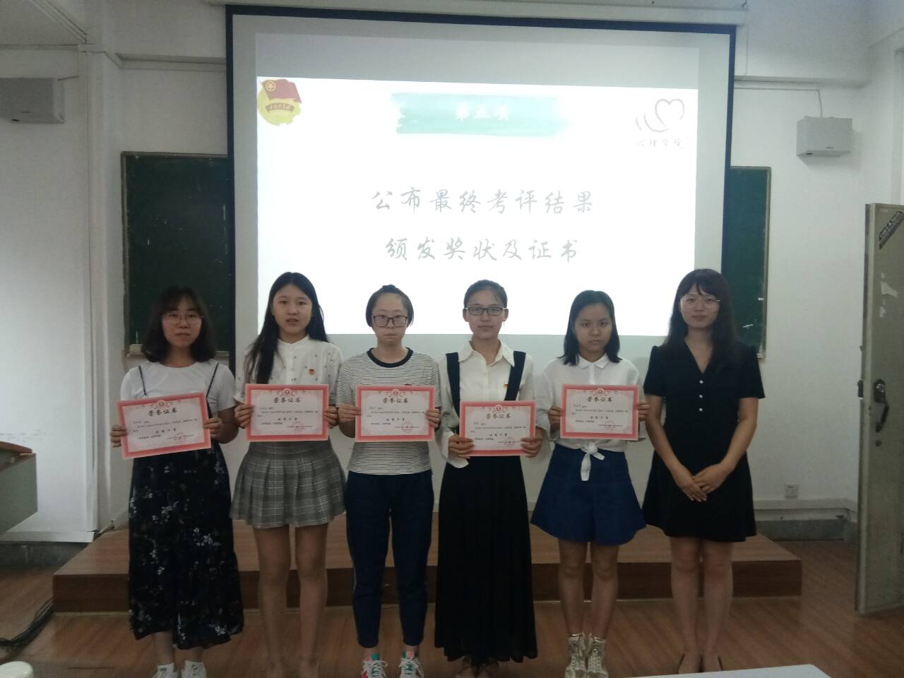 获得优秀干事称号的是:新闻宣传部干事蔡李雪、新闻宣传部干事高欣妍、青协志愿者协会成员吴佳荫、秘书部干事姜越文、秘书部干事黄盟、组织部干事黄晶菁,第十二届团委学生会主席闫瑾为他们颁奖。获得优秀部长称号的是:学科部部长叶子宁、组织部部长赵慧颖、秘书长王雪萍、社工部部长姜玉倩,第十二届团委学生会团委副书记陈舳娜为他们颁奖;获得优秀部门称号的是:秘书处、组织部、学科部,由心理学院团委书记吴艳老师为他们颁奖。