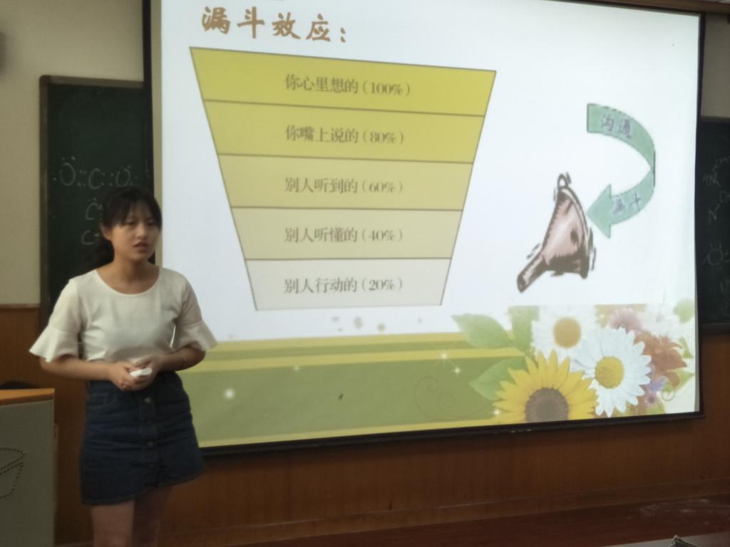 接下来上到讲台的潘月选手,给同学们带来了“沟通的艺术”,与同学的互动频繁,增强了教师与学生之间的互动联结,同时又加以细心引导,从“传声筒”到“解忧纸”,温馨甜美的风格便体现了出来。