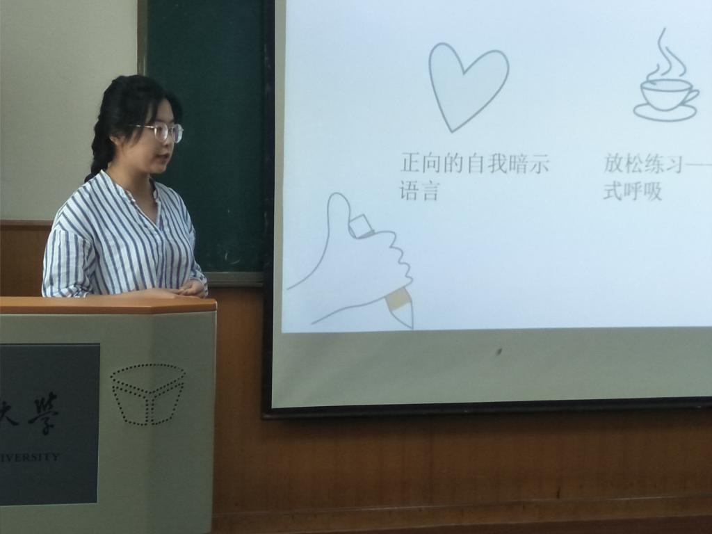 第一位选手吴晖以沉稳大方的讲课风格吸引了嘉宾老师的眼球。“轻松考试”的主题与面临期末考试压力的学生产生亲切的共鸣。她从准备考试的焦虑出发,分别给予了同学们考前考中考后的解压方法,吴晖还亲身演示了一种腹式呼吸的放松练习,以帮助同学们做好有效的心态调整。