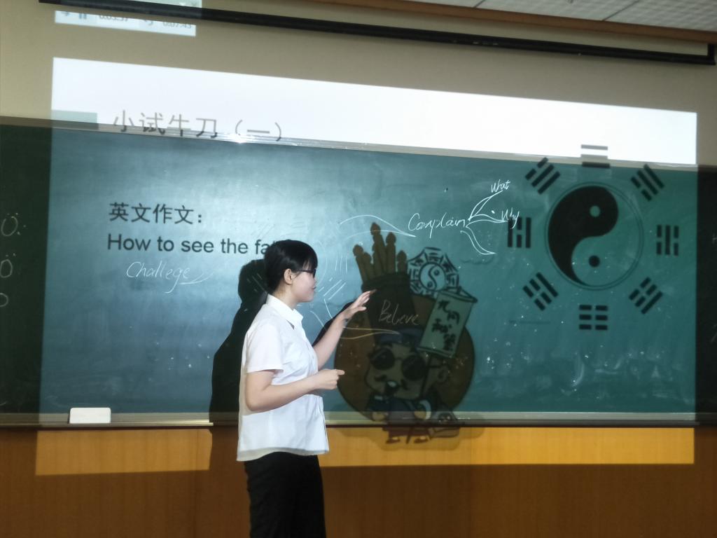第五位选手曲艺,没有直接呈现其要讲解的主题,而是拿出了神秘的八卦图,引用道家“三生万物”的理念揭开了这个主题:思维导图。曲艺对思维导图的讲解并不局限于PPT上,而是以审一道英语作文为例带领同学们一笔一画地制作,体会思维导图对整理思维的重要作用。