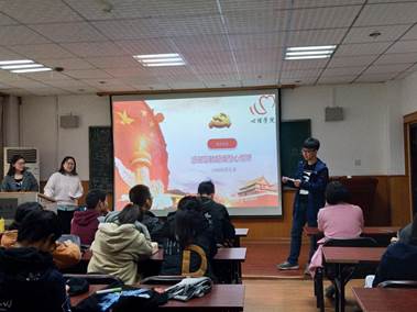 接下来是有奖竞答环节,由主持人向同学们提问一些关于十九大基本知识的问题,例如十九大召开时间,中国社会现在的主要矛盾,还通过图片让同学们说出中国共产党现任常委等等,在问答的过程中,同学们积极地回答问题,为自己的小组争得荣誉。之后黄盟结合同学们感兴趣的话题从雾霾、网络、旅游、健康中国、军事、智能、生态文明、精准扶贫等方面以十九大报告的角度解读,让同学们更加深刻地了解了十九大,了解中国现状。
