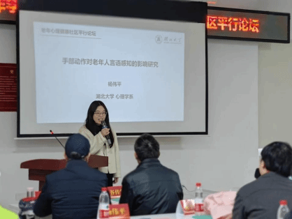 湖北大学杨伟平教授对肢体动作尤其是手部进行了深入研究,她分享了《手部动作对老年人言语感知影响的研究》报告。杨老师的研究极具实践性,让与会代表深入地了解到老年人发出的一些手部信号有何含义,也更明白其蕴含的心理机制。